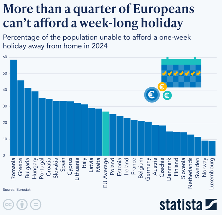 Esses vigor do movimento crescente de cidadãos europeus para dentro e fora do continente é um lado da moeda, cujo lado inverso está em pesquisa da Eurostat, o órgão de estatísticas da União Europeia: 27% das pessoas com 16 anos ou mais na União Europeia não tiveram condições financeiros para tirar férias de uma semana em 2024.