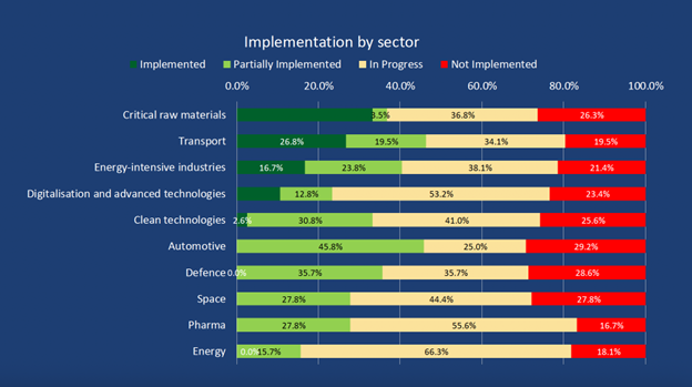 Um levantamento do Draghi Observatory, ligado ao European Policy Innovation Council, revela que um ano depois da apresentação do relatório apenas 11,2% das 383 recomendações foram plenamente implementadas. Quase metade ainda está em andamento e mais de um quinto nem foi iniciado.